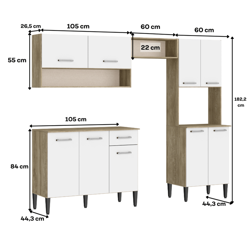 Medidas totais: Largura: 225 cm | Altura: 182,2 cm | Profundidade aéreos: 26,5 cm | Profundidade balcão: 44,3 cm