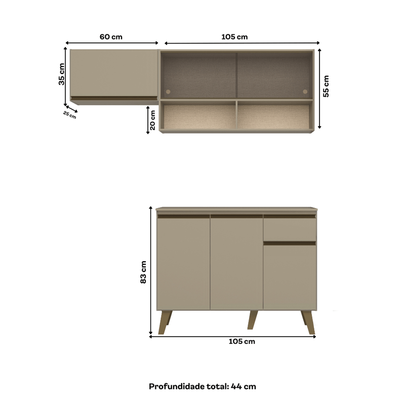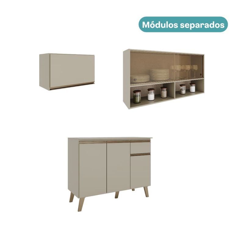 Composta por módulos versáteis, conta com um armário aéreo de duas portas de vidro e nicho incluso, um armário aéreo de 60cm e um balcão de 105cm com gaveteiro. Equipada com puxadores e pés em ABS, dobradiças e corrediças metálicas e elaborada em MDP de alta qualidade, essa cozinha oferece durabilidade, resistência e sofisticação em cada detalhe!