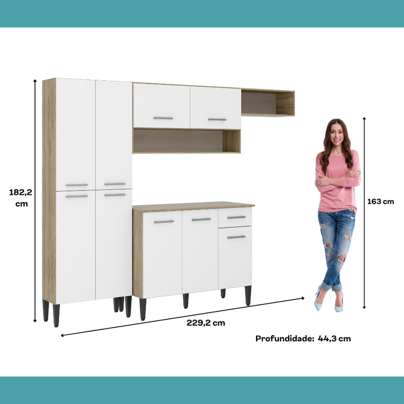 Medidas totais: Largura: 229,2 cm | Altura: 182,2 cm | Profundidade aéreos: 26,5 cm | Profundidade balcão: 44,3 cm