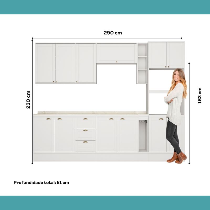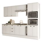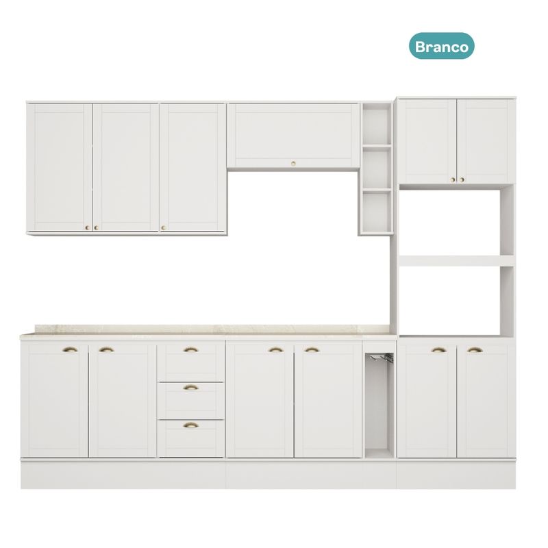 A Cozinha Milla Dreamer lembra as tradicionais cozinhas norte-americanas, com detalhes especiais em frisos e puxadores – porém, tudo em uma simplicidade visual. Possui 7 módulos, entre eles aéreo com 3 portas 1200 mm, balcão com 1200 mm, aéreo basculante de 800 mm e torre quente com espaço para armazenamento de forno e microondas, balcão de 800 mm, nichos aéreos para armazenar temperos ou decorações e porta toalhas! Conta também com puxadores em metal no acabamento “ouro velho” e matéria-prima em BP e MDF, criando uma harmonia fantástica com os demais itens dentro do espaço em que a cozinha está inserida.