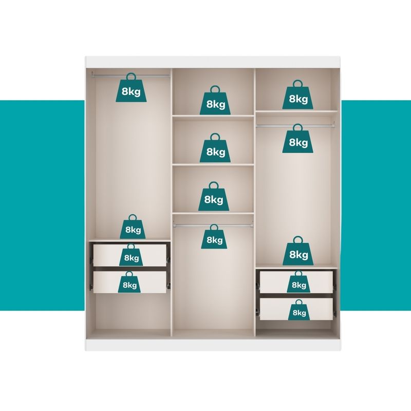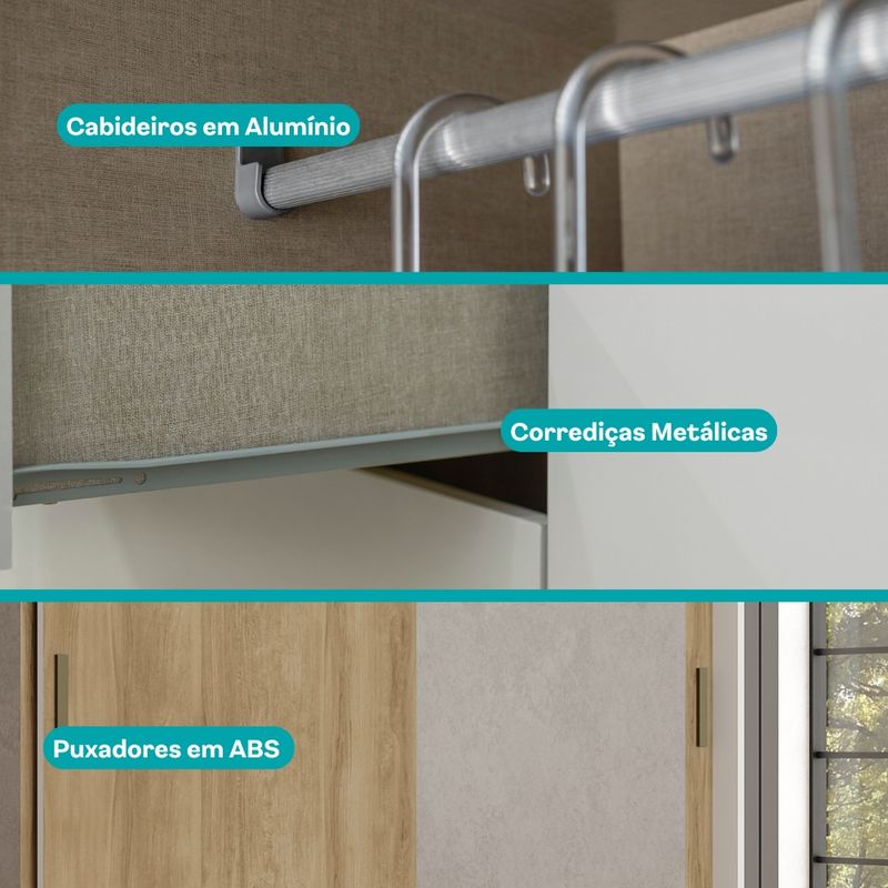 Cabideiro: 3 (alumínio) | Prateleiras: 6 (internas)