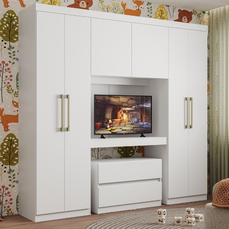 O Roupeiro Porto Infantil possui 6 portas de batente e gaveteiro móvel. É um produto chave para diferentes necessidades, já que sua peça central pode ser montada de diversas formas, como: painel de TV, mesa de escrivaninha ou cabeceira de cama de solteiro. Além disso, o gaveteiro solto permite a utilização da peça em vários cantos do ambiente.