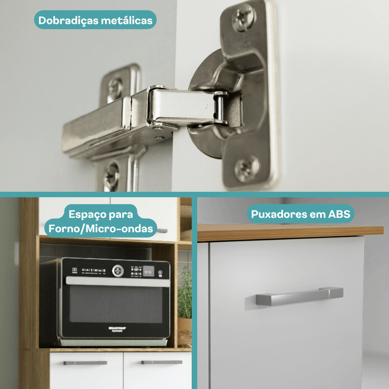 A Torre quente 2783 é uma peça que traz versatilidade para a sua cozinha, elevando a funcionalidade e organização. Projetada para acomodar um forno micro-ondas ou elétrico, esse armário contribui significativamente para a organização do espaço e oferece amplo armazenamento em seus compartimentos superior e inferior. Com um design que vai além da praticidade, a torre quente traduz a essência e a personalidade do usuário. Seu exterior é revestido com MDP de 12mm e acabamento em BP, puxadores em ABS na cor prata que proporcionam durabilidade e resistência. As quatro portas de giro com dobradiças metálicas garantem fácil acesso, enquanto os pés plásticos possui regulagem, conferindo estabilidade, e ajustável a diferentes superfícies.